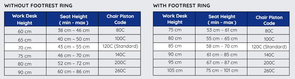 The seating height of your chair can be adjusted using gas lifts of different sizes depending on your usage preference. You can select the appropriate gas lift size for your planned working height from the table below.